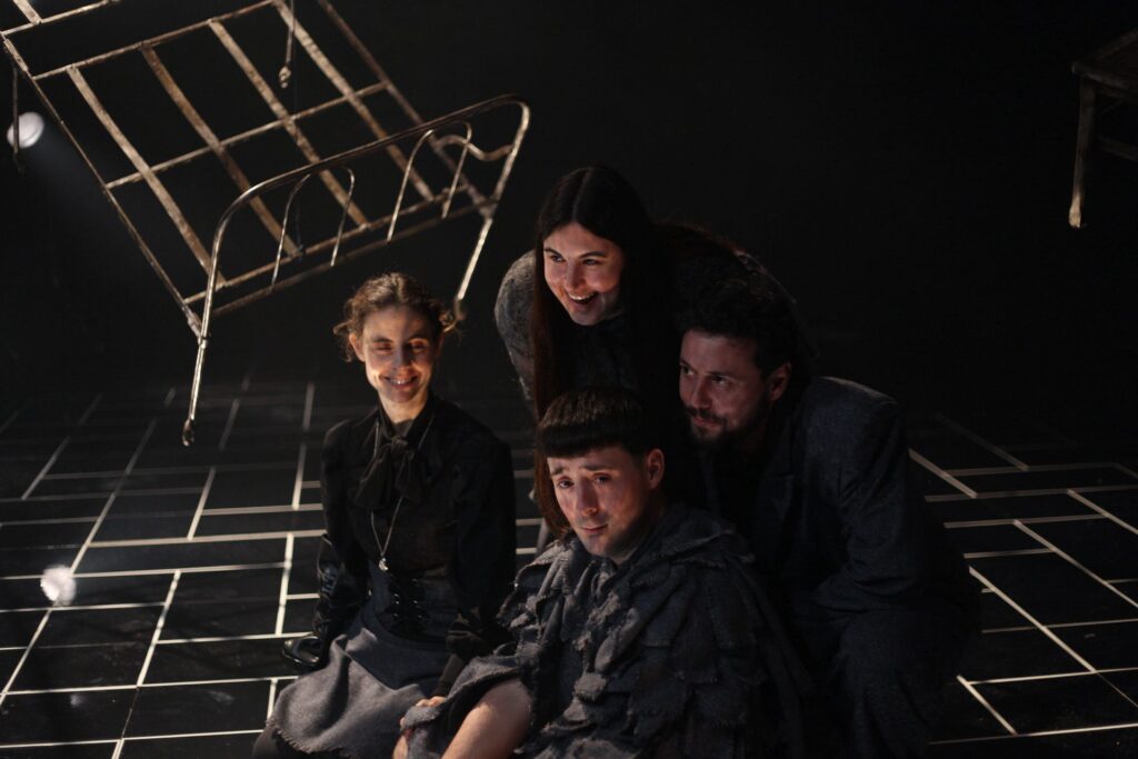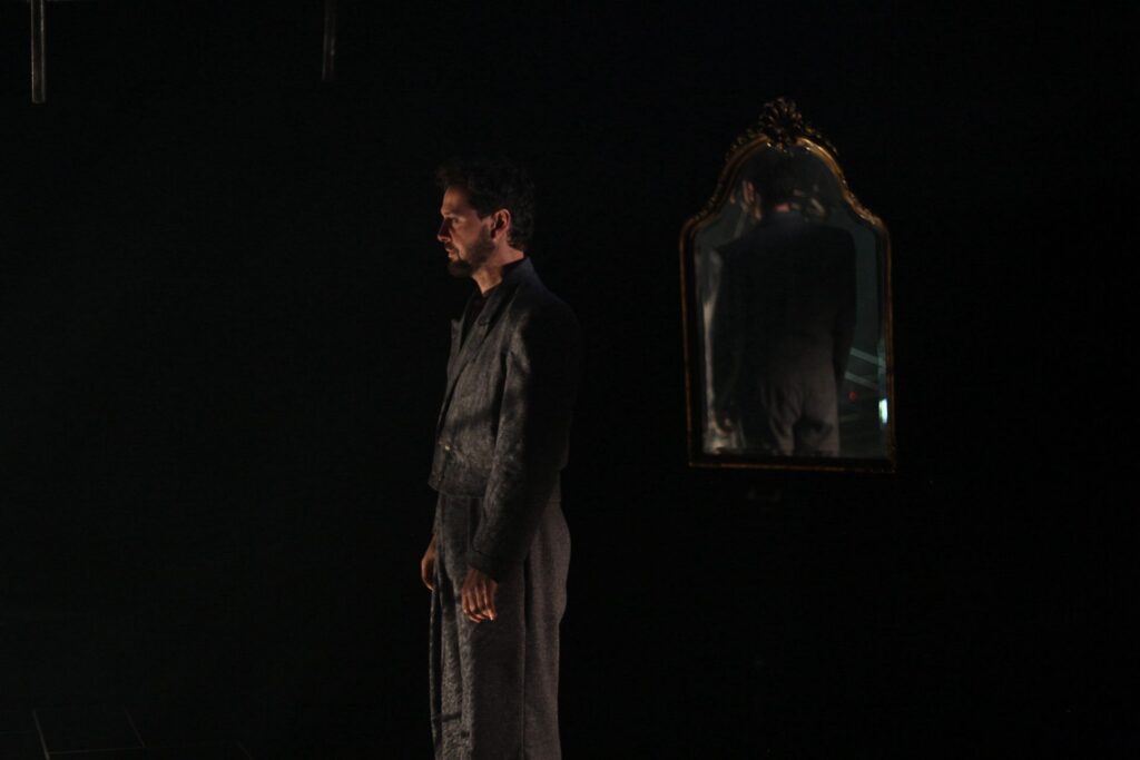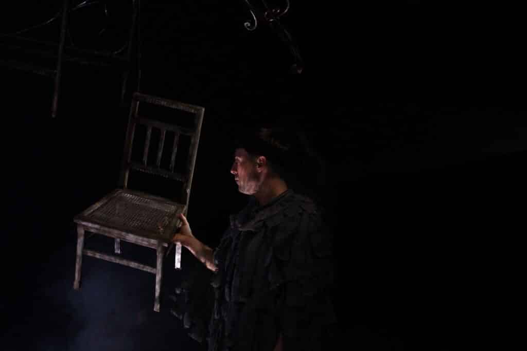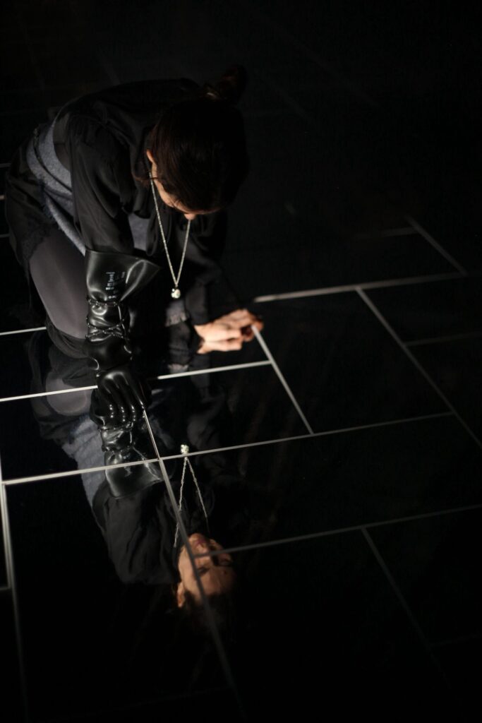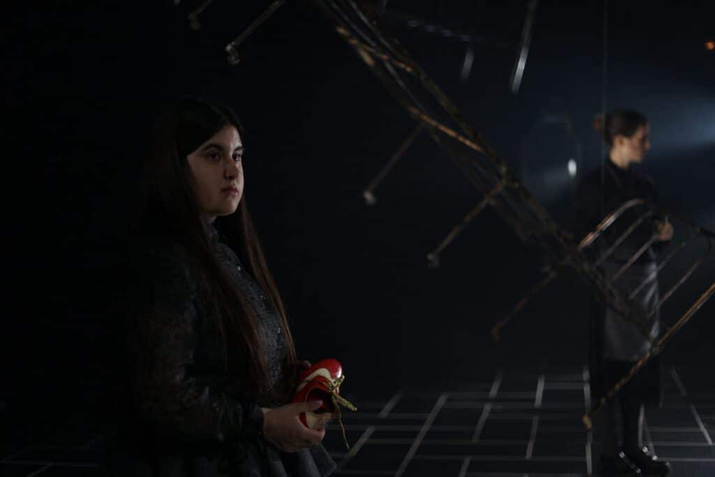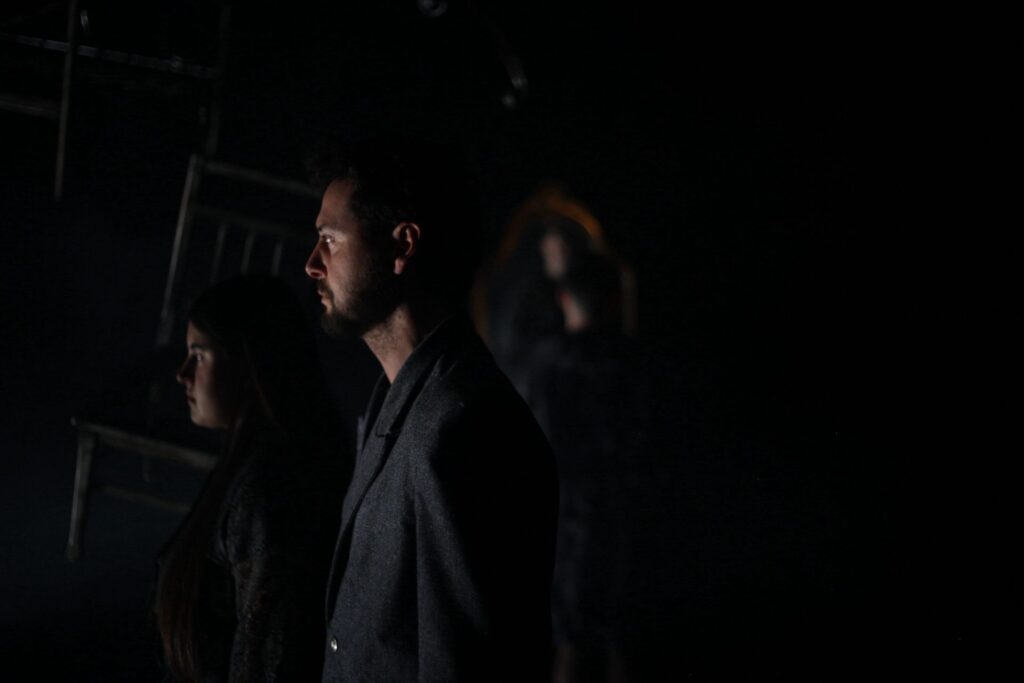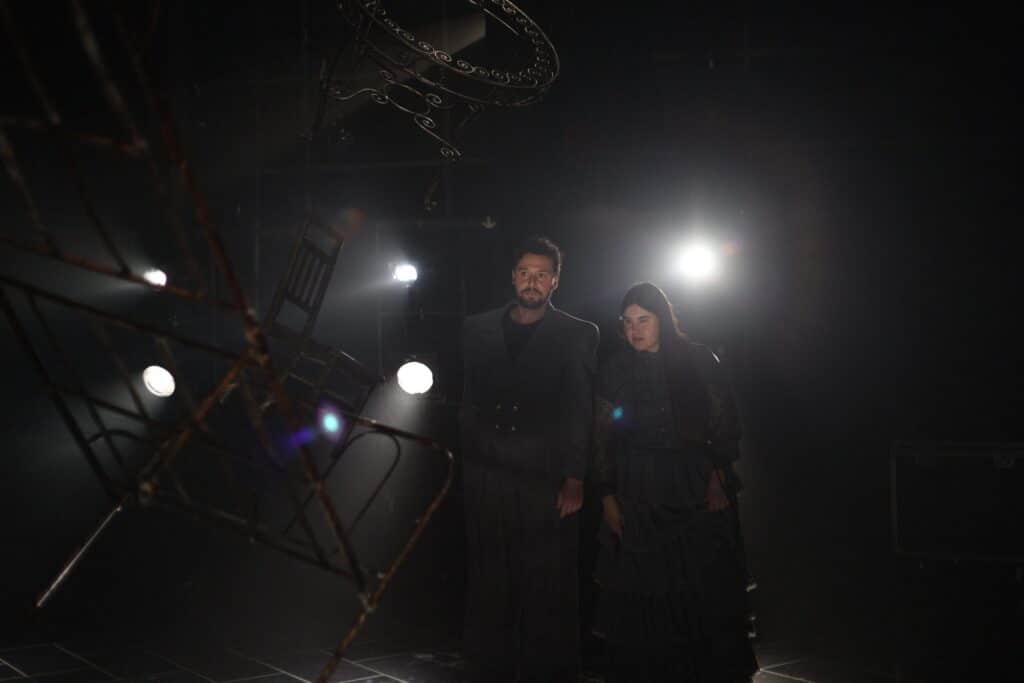 En un replà que no pertany a cap edifici concret i, alhora, podria ser l’avantsala de qualsevol pis, On s’acaba el nom aixeca una escena feta de restes: esquelets metàl•lics de somier i capçaleres de llit, el perfil d’un sofà, una taula, una cadira, un mirall. Són fragments domèstics convertits en arquitectura mental, com si el muntatge proposés una llar desossada i reordenada segons les lleis d’un record: no hi ha realisme d’interiors, sinó una instal•lació abstracta. Predominen els foscos —negres, grisos, tonalitats apagades—, però el dispositiu es matisa amb reflexos: el terra, el metall i el mirall retornen la llum en punts i vores. També el moviment està calculat amb una precisió coreogràfica: gestos recurrents, trajectòries circulars, accions que recomencen com un ritual. Aquesta repetició corporal dialoga amb la del text: la paraula torna, varia i insisteix, per trobar sentit.